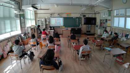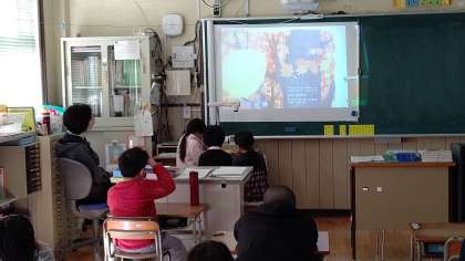 1年生が朝の会で、本の読み聞かせをしています。友だちが読んでいるお話を静かに聞いています。