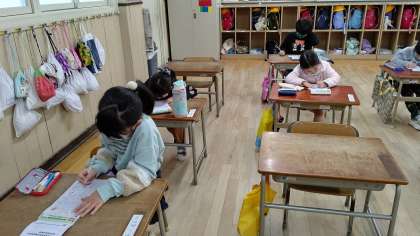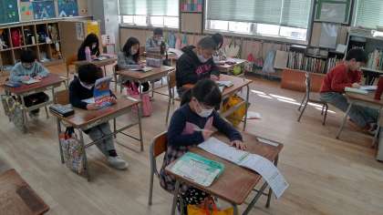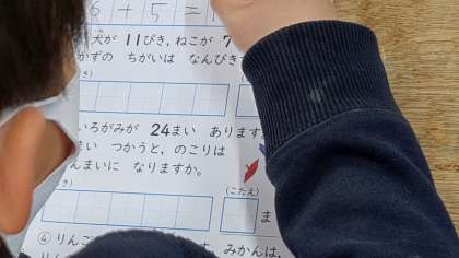 1時間目、1年生が算数の学習をしています。「文章題」をしています。