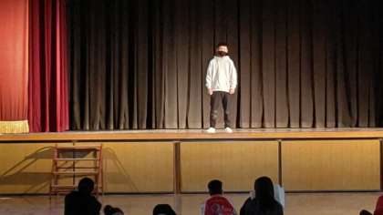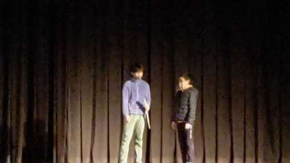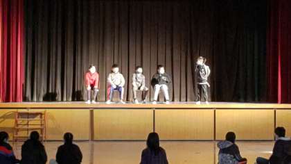 1時間目、6年生が講堂で総合の学習をしています。舞台発表「歴史劇」の練習をしています。