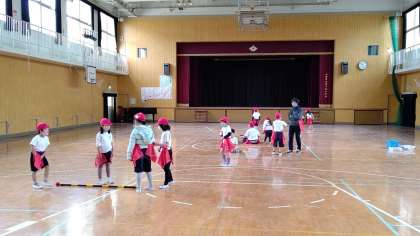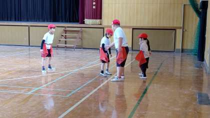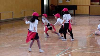 2時間目、1年生が講堂で体育の学習をしています。二人一組になって、仲間に守られて、腰のタグを取られないように相手の陣地に玉をおきにいくゲームをしています。