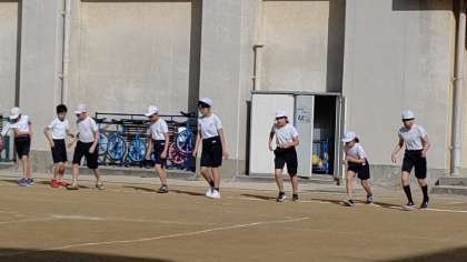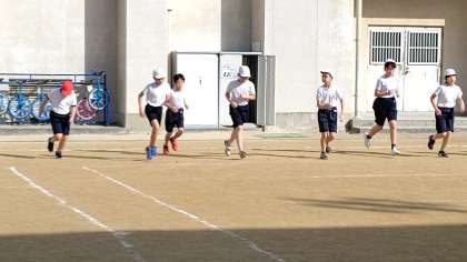 6時間目、5年生が運動場で体育の学習をしています。「20mシャトルラン」にチャレンジしています。みんな自分の限界まで走っています。