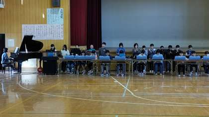 6時間目、4年生が講堂で音楽の学習をしています。「卒業生を送る会」のビデオ撮りをしています。