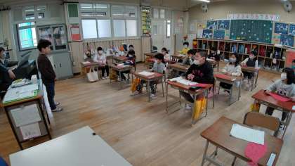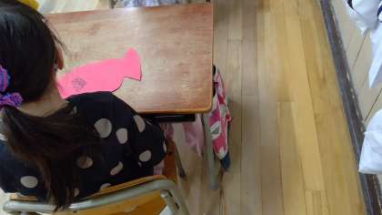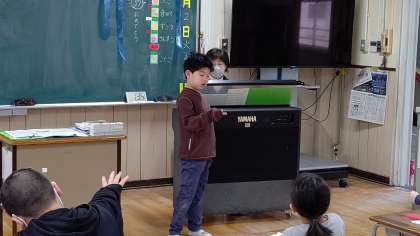 1時間目、1年生が国語の学習をしています。「スイミー」の劇の練習をしています。