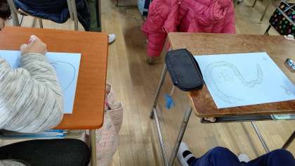 1時間目、5年生が図工の学習をしています。「針がねアート」「版画」をしています。