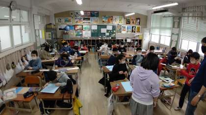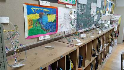 教室のうしろに完成した「針がねアート」作品が展示しています。