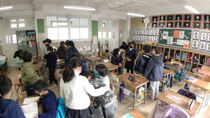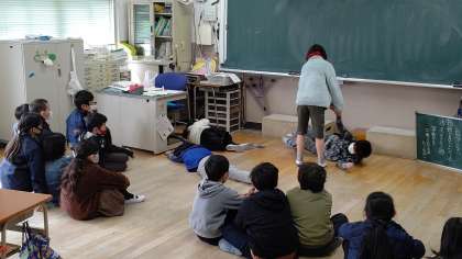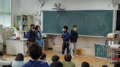 2時間目、4年生が総合の学習をしています。各班が考えた「劇 ー表現活動」を発表しています。