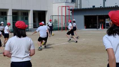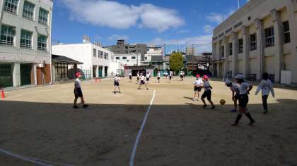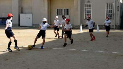 3時間 目、5年生が運動場で体育の学習をしています。変則ルールで「サッカー」をしています。