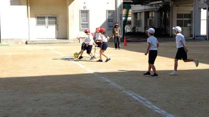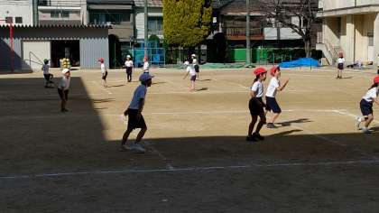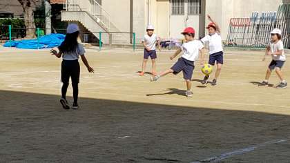 5時間 目、2年生が運動場で体育の学習をしています。「サッカー」のゲームをしています。