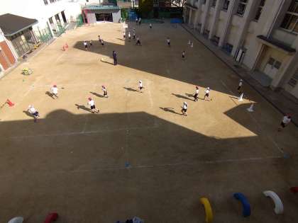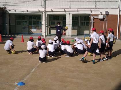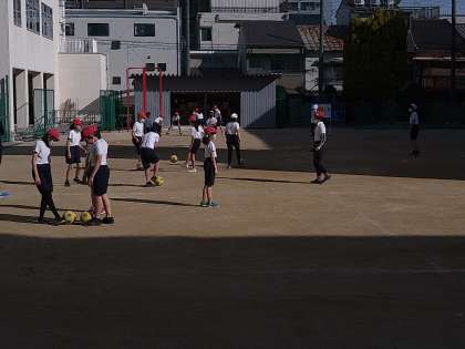運動場でラインサッカーをしました。ルールや役割を工夫して楽しくゲームできるようにしています。パスやドリブルなどの基本的な練習をしてからゲームをしています。