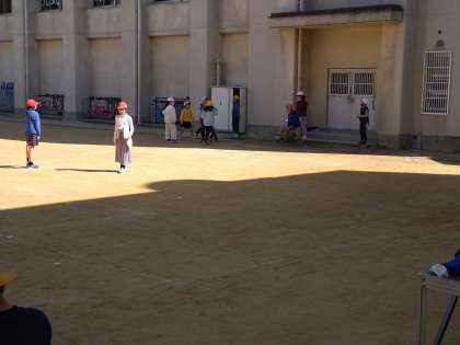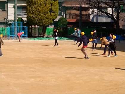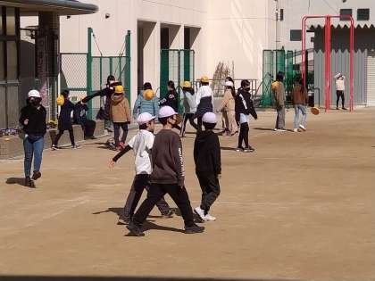 運動場で4年生が「けいどろ」、5年生が「ふえおに」をそれぞれクラス遊びとしておこなっていました。総勢およそ50名が所狭しと追いかけ、逃げ回っていました。