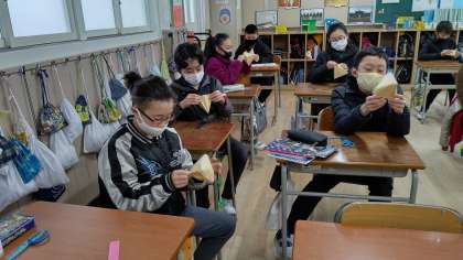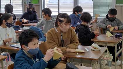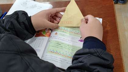 2時間 目、6年生が算数の学習をしています。「封筒を使って、三角錐」を作っています。