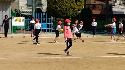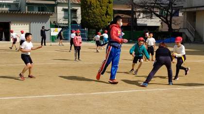 2時間目、3年生が運動場で体育の学習をしています。「タグラグビー」をしています。教頭先生と鈴木先生が参加しています。