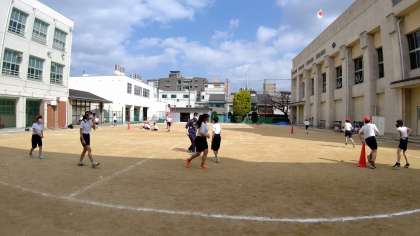 2時間目、6年生が運動場で体育の学習をしています。「7分間走」をしています。7分間で何周走れるかを測っています。