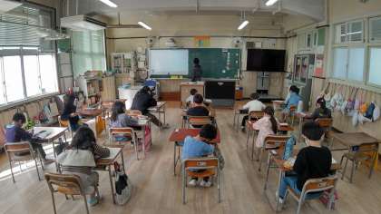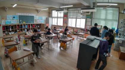 1時間目、1年生が算数の学習をしています。「1年間のまとめ問題」をしています。