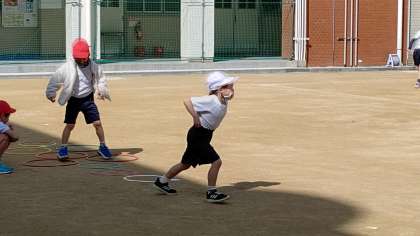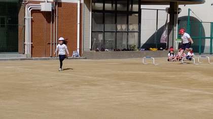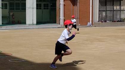 2時間目、1年生が運動場で体育の学習をしています。運動場全面を使って活動しています。