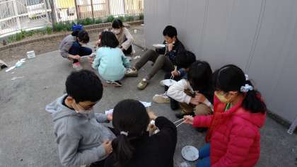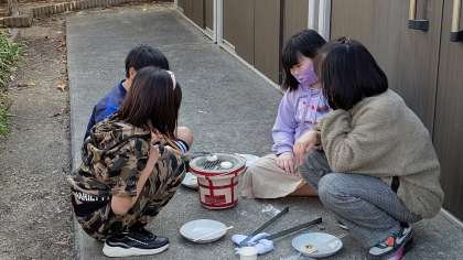 6時間目、5年生が講堂前で「七輪でモチ」を焼いています。