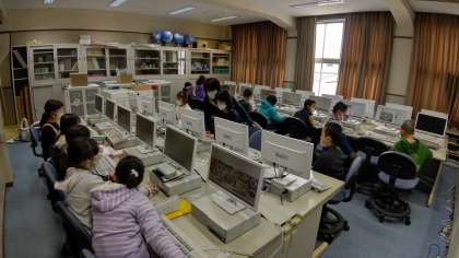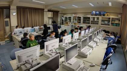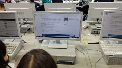 1時間目、3年生がパソコン教室で、七輪の「炭の火のつけ方」を調べています。