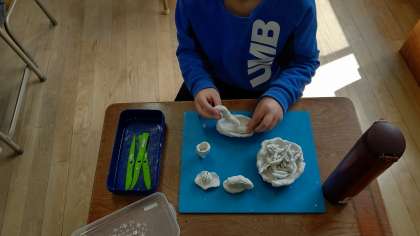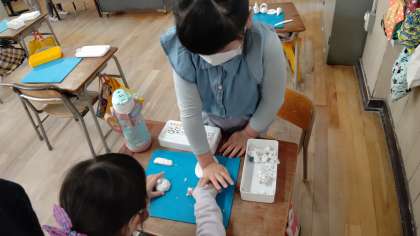 3時間目、1年生が図工の学習をしています。「粘土でいろんな物」を作っています。