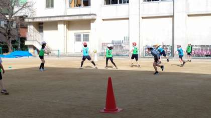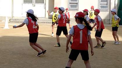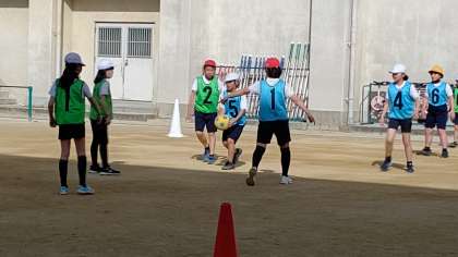 6時間目、4年生が運動場で体育の学習をしています。「サッカー」のゲームをしています。みんな元気に走り回っています。