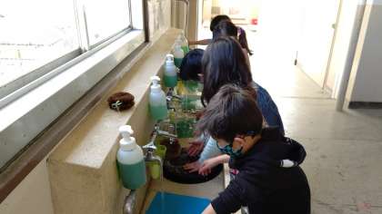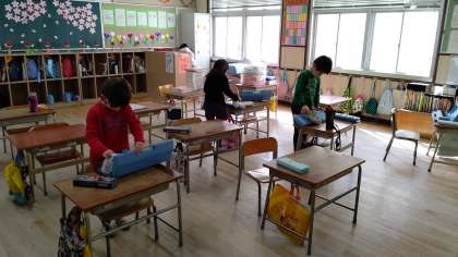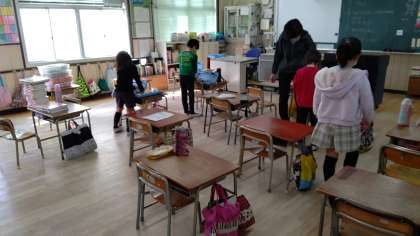 1時間目、1年生が教室と自分のロッカーの中をきれいにしています。
