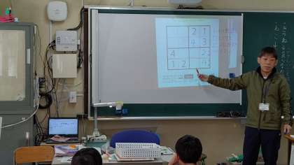 2時間目、2年生が算数の学習をしています。「1~4の数字を入れる」たてと横に同じ数字は、使えません。
