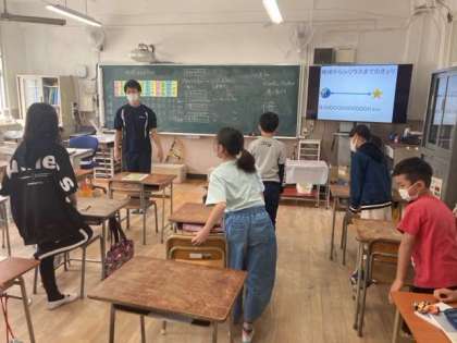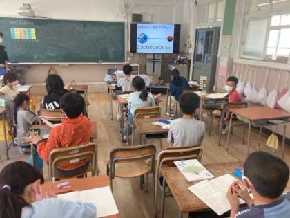 4年生の4時間目は算数です。地球から月や土星の距離を考えながら大きな数の学習をしています。地球からシリウスまでの距離は、80000000000000キロメートル!