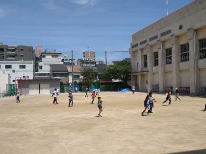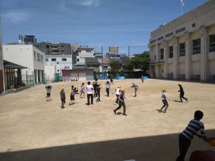 多くの4・5年の子ども達が一緒に鬼ごっこをして遊んでいます。