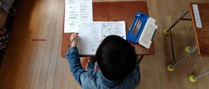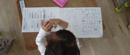 算数となぞり書きのプリントをしています。プリントが終わったら読書をしています。