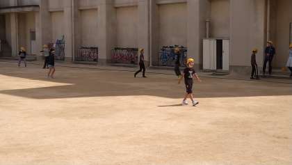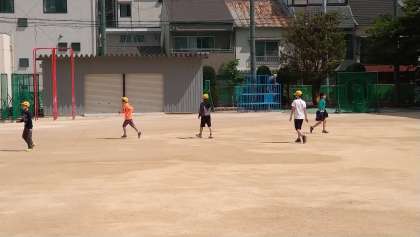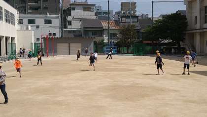 5年がたくさんの人数で「けいどろ」を4年女子が鉄棒をして遊んでいます。