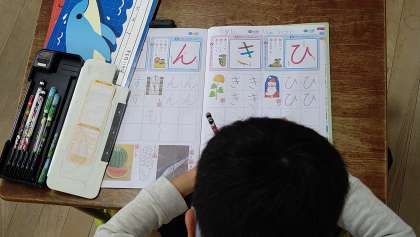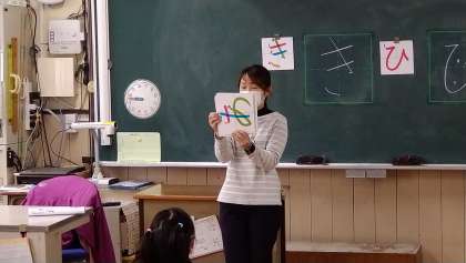 ひらがなワークを使って、「ひ」と「き」の練習をしています。形をとるのが難しいひらがなを練習しています。習ったひらがなや数字をフラッシュカードのようにみんなで言っています。
