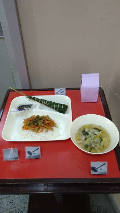 本日の給食はこどもの日の行事献立です。メニューは、きんぴらちらしとちまき、そしてすまし汁、牛乳です。