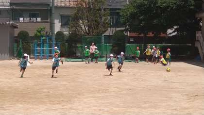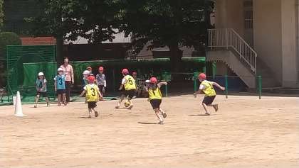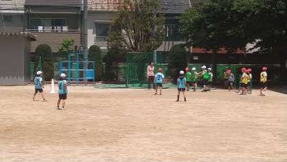 初めてのキックベースボールです。ゲームの進め方、ルールを確認しながら楽しんでいます。