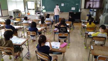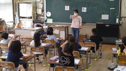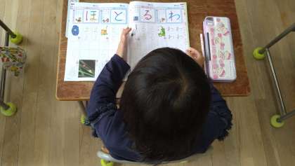 ひらがなの学習をしています。今日は「わ・る」を練習しています。空気黒板で気を付けるところを確認しながら進めています。