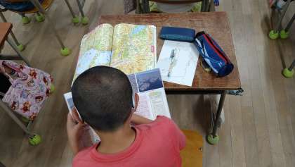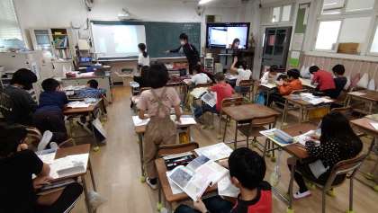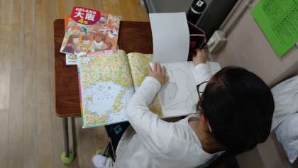 社会の学習です。大阪府の山地・台地・平野を調べて白地図に書き写しています。