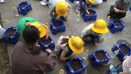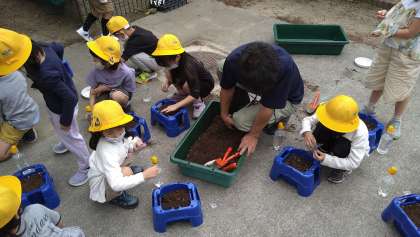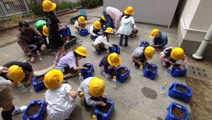 1階の体育館の近くであさがおの種を植木鉢に埋めています。これから水やりをして育てていきます。