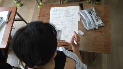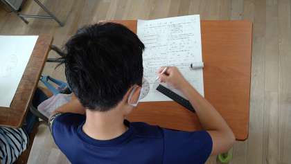算数の図形のテストをおこなっています。合同な図形を作図したり、三角形の角度を求めたりしています。