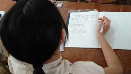 算数の分数のかけ算です。分数?整数の問題に取り組んでいます。図をかいて視覚的にわかるように進めています。