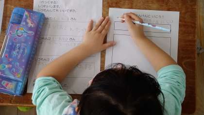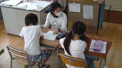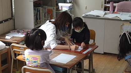 せいかつの学習で学校探検をしました。学校の様々な場所に行き、担当職員に1人1つ質問をしました。教室に戻ってワークシートにまとめています。