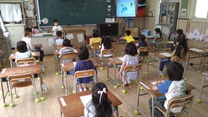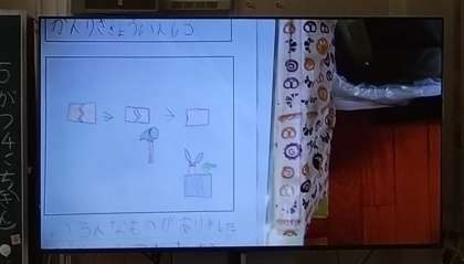 生活の学習です。学校探検で調べたことを書画カメラを使い、大型モニターに映して発表しています。
