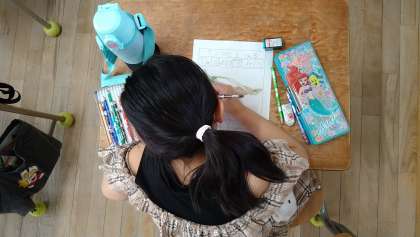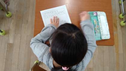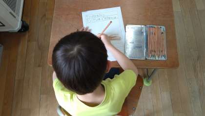 生活の学習です。学習園に植えたサツマイモの苗を観察し、ワークシートに絵と文でまとめています。
