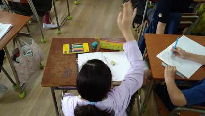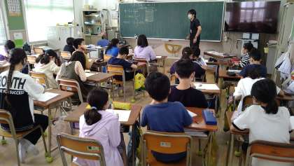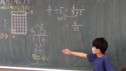 算数の学習をしています。分数÷整数の学習です。なぜ、そのように計算するのかを困っている人に説明しています。やり方だけではない数学的思考力を高めています。
