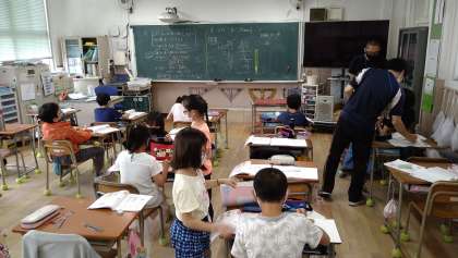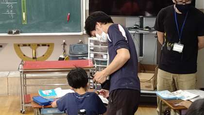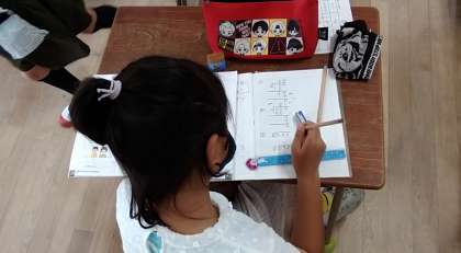 算数の学習をしています。3桁÷1桁であまりのある問題に取り組んでいます。筆算で十の位から商が立つことに気を付けて計算しています。