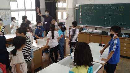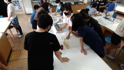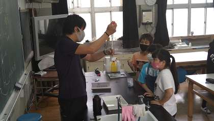 理科室で実験をしています。「ヒトや動物の体」という単元で、ヨウ素液を使い、でんぷんの変化を調べています。