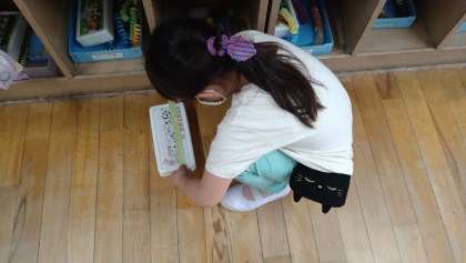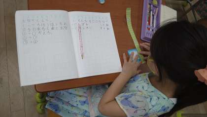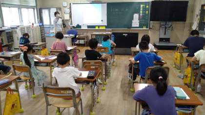 算数の学習をしています。「いろんなもののながさ」を問題として教室内のさまざまものの長さを計っています。