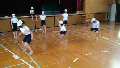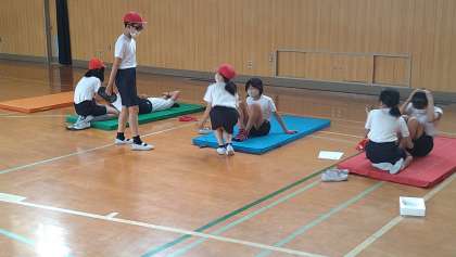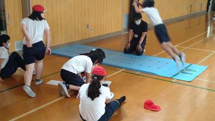 体育館で新体力テストをおこなっています。グループで協力しながら計測をしています。