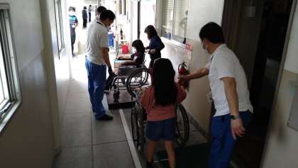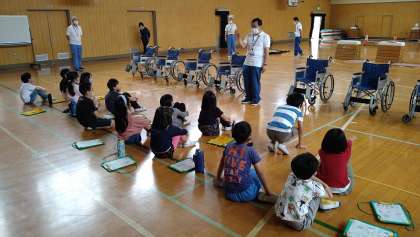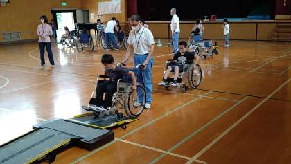 リハビリテーションセンターの方々にお越しいただき、車いす体験をしています。3時間目は体育館で、4時間目は廊下やスロープでおこなっています。車いすに乗って1人で操作したり、ペアになって乗る人と介助する人とを交代したりして活動しています。