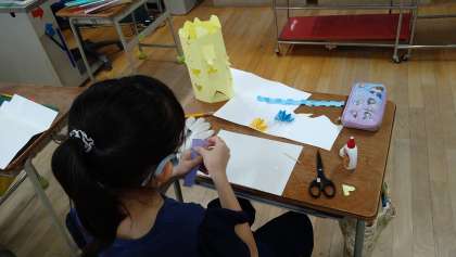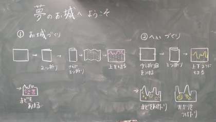 「夢のお城へようこそ」の続きをしています。お城づくりが終わってからへい作りをしています。オリジナリティあふれる作品を制作中です。