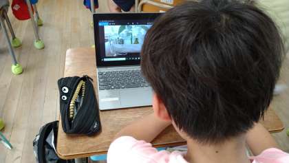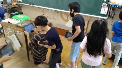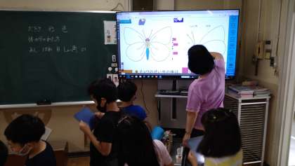 「チョウの成虫の体はどんなつくりになっているのだろうか」を学習しています。飼っているチョウが成虫になったタイミングと重なったので、タブレット端末で写真をとり調べています。