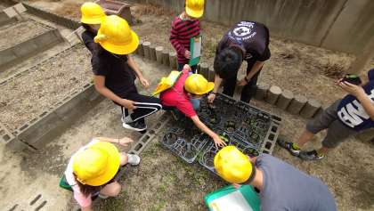 ポットで育てたヘチマの苗の植え替えをしています。正門を入った左側校舎の壁にネットを張って育てます。