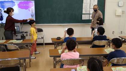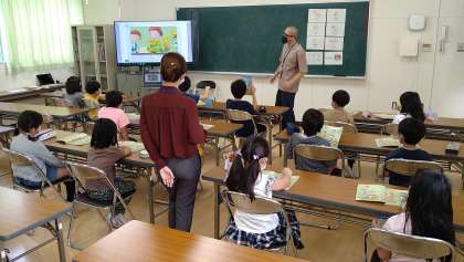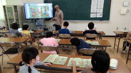 外国語の学習は、山本先生とスヌーキー先生が担当しています。授業用PCとモニターを使って学習を進めています。今日は「How are
